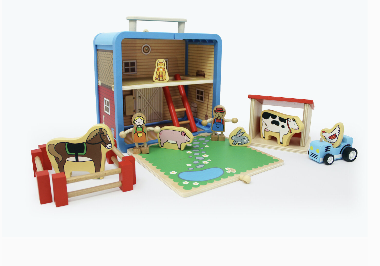 The Suitcase Series that encourages portable play. Each wooden suitcase opens up to a world of fun. The 16-piece Barnyard has everything for fun on the go, including farmer kids, fences, farm animals, a tractor, and more!